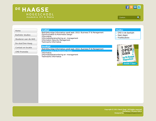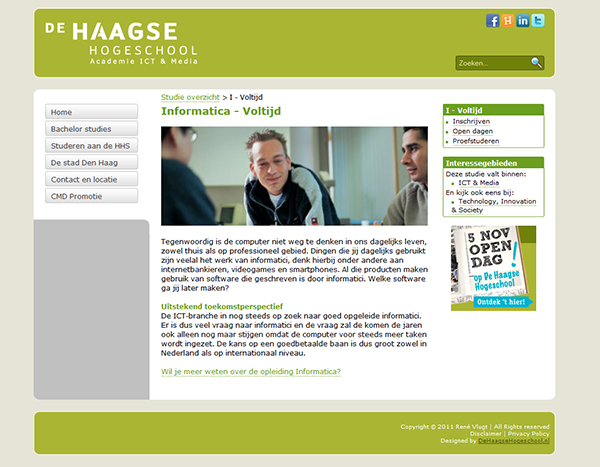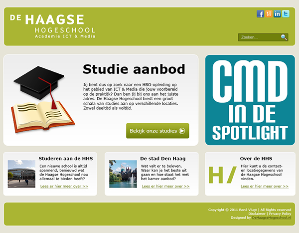 Op mijn opleiding krijg je elke 10 weken een nieuwe casus voorgelegd. De eerste casus die ik op mijn opleiding voogelegd kreeg was afkomstig van de Haagse Hogeschool. Er zouden niet genoeg aanmeldingen zijn voor de ICT-opleidingen en dat zou te wijden zijn aan de website van de Haagse Hogeschool. Er werd ons dan ook gevraagd om een nieuwe website te ontwikkelen voor de acadamie van ICT & Media waarbij de navigatie soepeler zou verlopen en de opleiding CMD meer in de spotlight zou worden gezet.